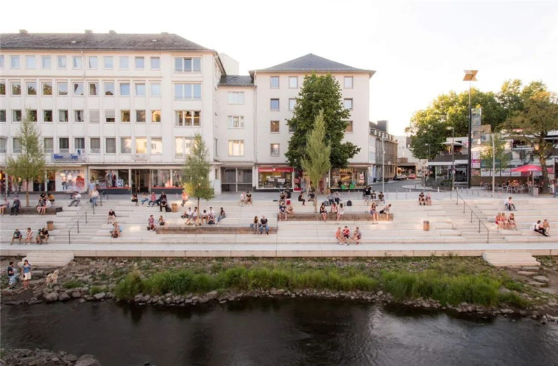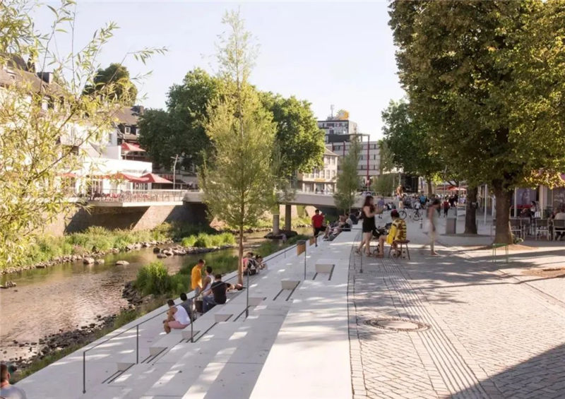 在拆除“ Siegplatte”(位于Sieg河堤防上的停車場)之后,2012年至2016年期間沿著河段的大規(guī)模臺階建設(shè)使得新的直接通往河段的河流成為可能。錫根市中心。希格(Sieg)自然化,擁有草皮的島嶼和岸堤,可以使水生動物和兩棲動物通過生物通道。180米長的樓梯雕塑在河邊,成為城市與河流互動的表演舞臺。鑒于西格(Sieg)的自然風(fēng)光,西格特雷彭(Siegtreppen)變成了聚會場所。流域變成了上下城鎮(zhèn)之間的墊腳石。該項目獲得了無數(shù)獎項,并獲得了2017年德國景觀建筑獎的“綠色基礎(chǔ)設(shè)施作為戰(zhàn)略”類別。